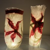 Explore the art of wet felting and create a holiday themed illuminated vase. When your wet felted vase cover is complete, you’ll be able to add lights and have a lovely holiday centrepiece or gift.