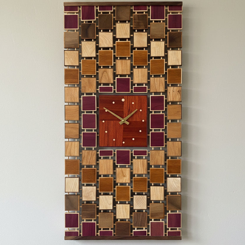 This stunning clock is painstakingy crafted from a variety of exotic and domestic wood pieces.