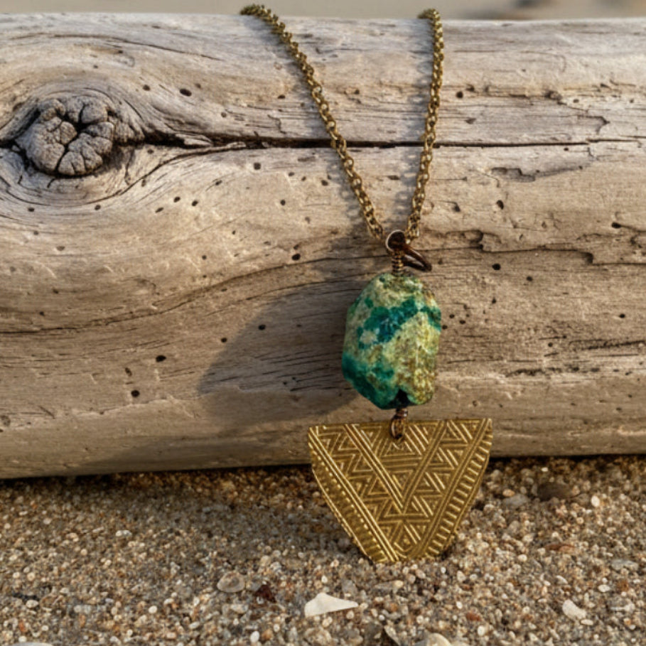 She uses metal clay, which is clay consisting of very tiny particles of bronze or copper mixed with an organic binder and water. When the clay is fired it burns away leaving solid metal. The finished pieces are tumbled, patinaed or left natural & polished. Natural gem stones are included in some designs.Chains are antiqued brass.