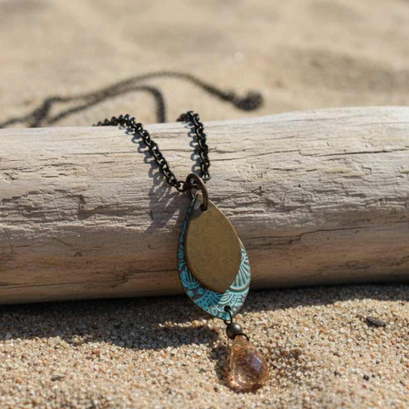 She uses metal clay, which is clay consisting of very tiny particles of bronze or copper mixed with an organic binder and water. When the clay is fired it burns away leaving solid metal. The finished pieces are tumbled, patinaed or left natural & polished. Natural gem stones are included in some designs.Chains are antiqued brass.