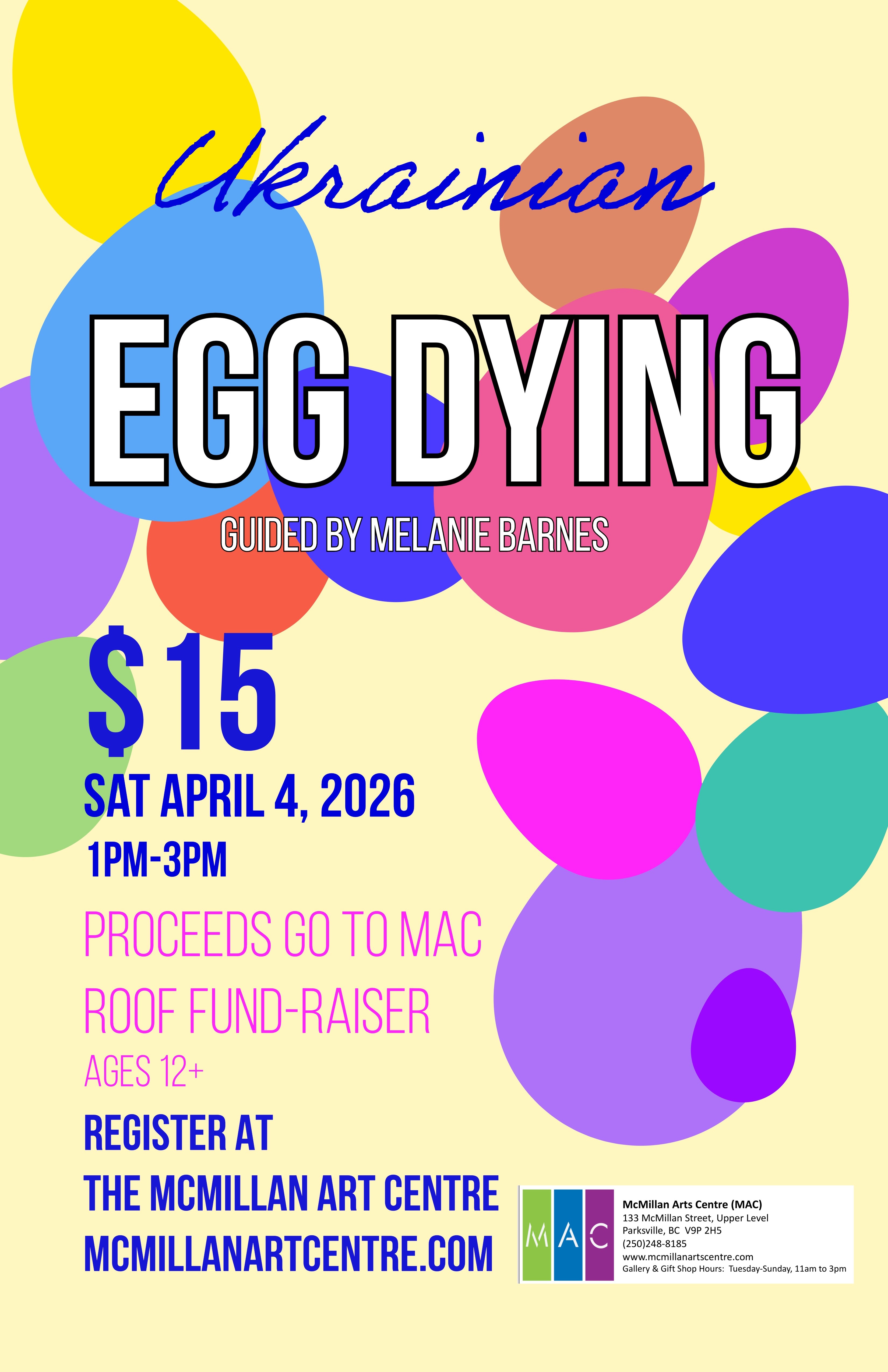 Come try out traditional Ukrainian Egg Dying using a kistka and wax to create intricate designs. Supplies will be available. All proceeds go to the MACs roof fundraiser.